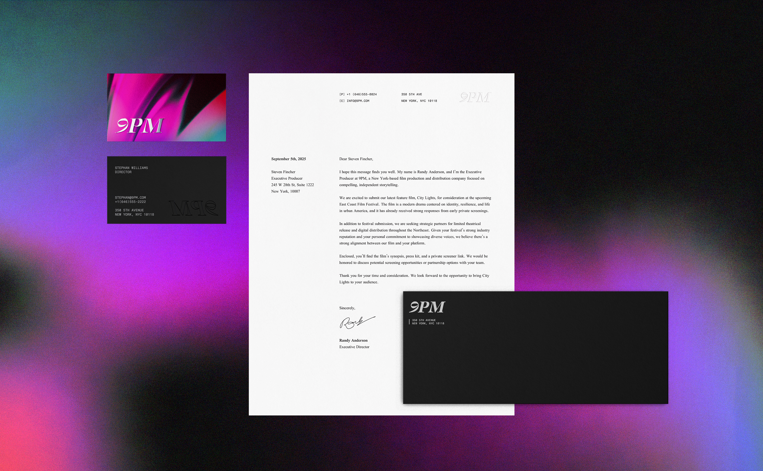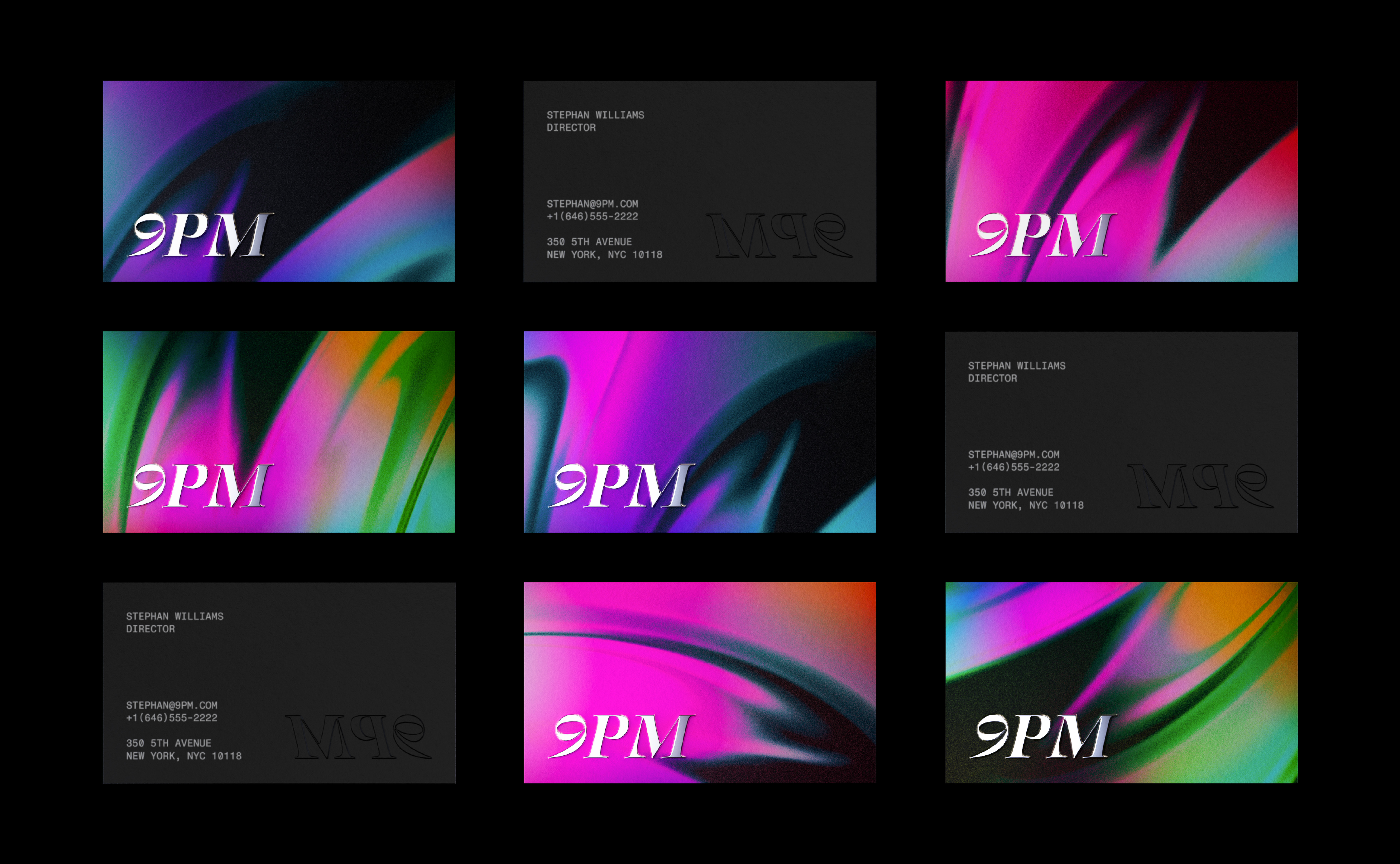 This is a personal identity project I started during my summer break last year. It’s for a company called 9PM, an independent film production and distribution company based in NYC. I used a lot of gradients and abstract shapes for this project because it captures the experimental and innovative spirit of the studio. The gradients are placed against a black background to create a cool, captivating and distinct mood. In addition, I chose a serif and monospaced typeface to give the studio a sense of professionalism and refined feeling.